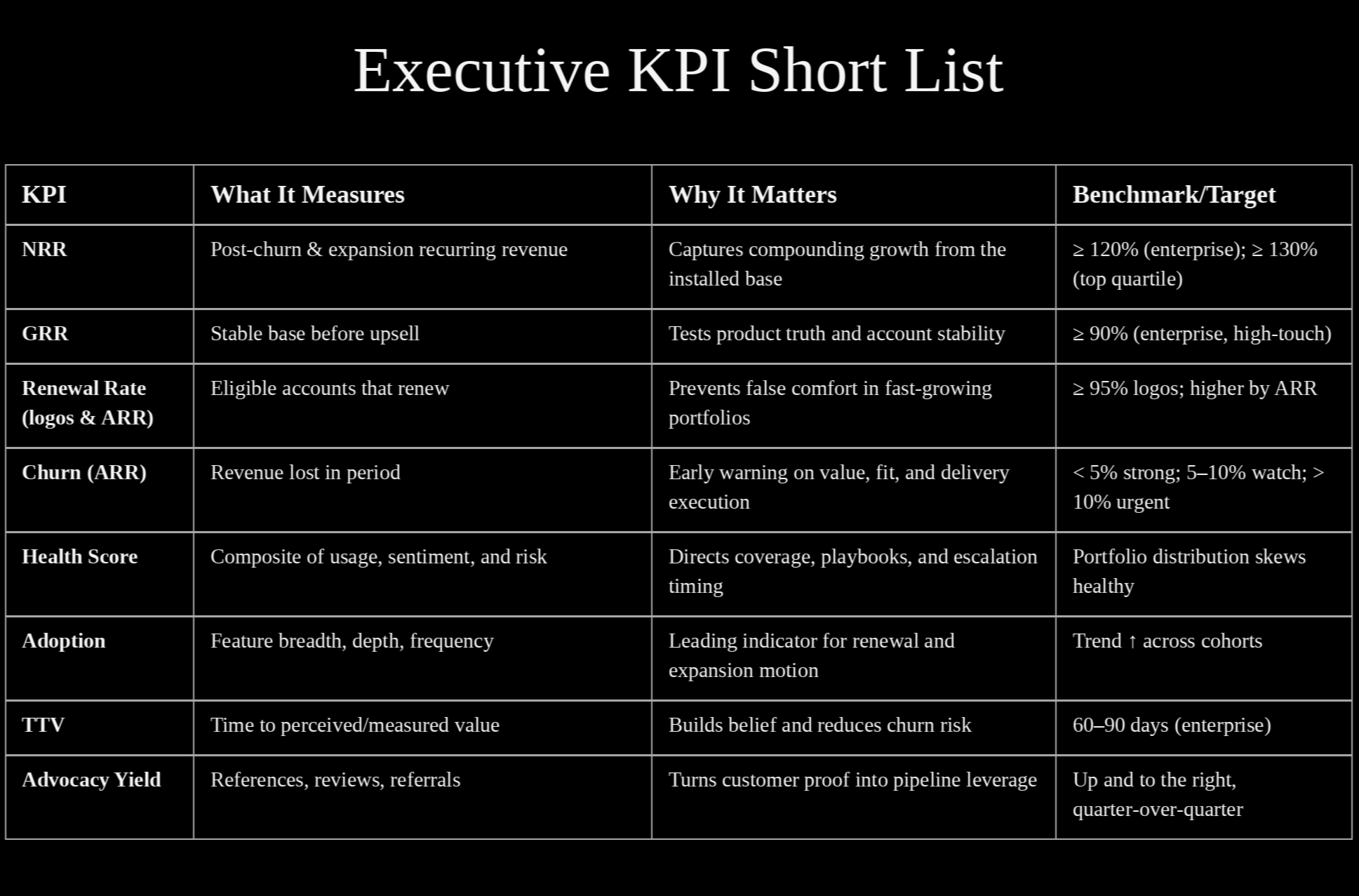 Start with the foundation: NRR, GRR, renewal rate, and churn (segmented by cohort and customer size). Add a health score only when you have enough data to validate it, and weight relationship quality heavily for strategic accounts. Layer in engagement and sentiment metrics as your CS motion matures. And design your system to spot risk 6-9 months before renewal, not 30 days before.